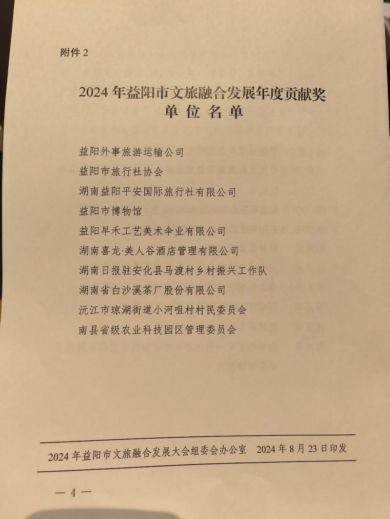 熱烈祝賀湖南益陽平安國際旅行社有限公司榮獲:2024年益陽市文旅融合發(fā)展年度貢獻獎!